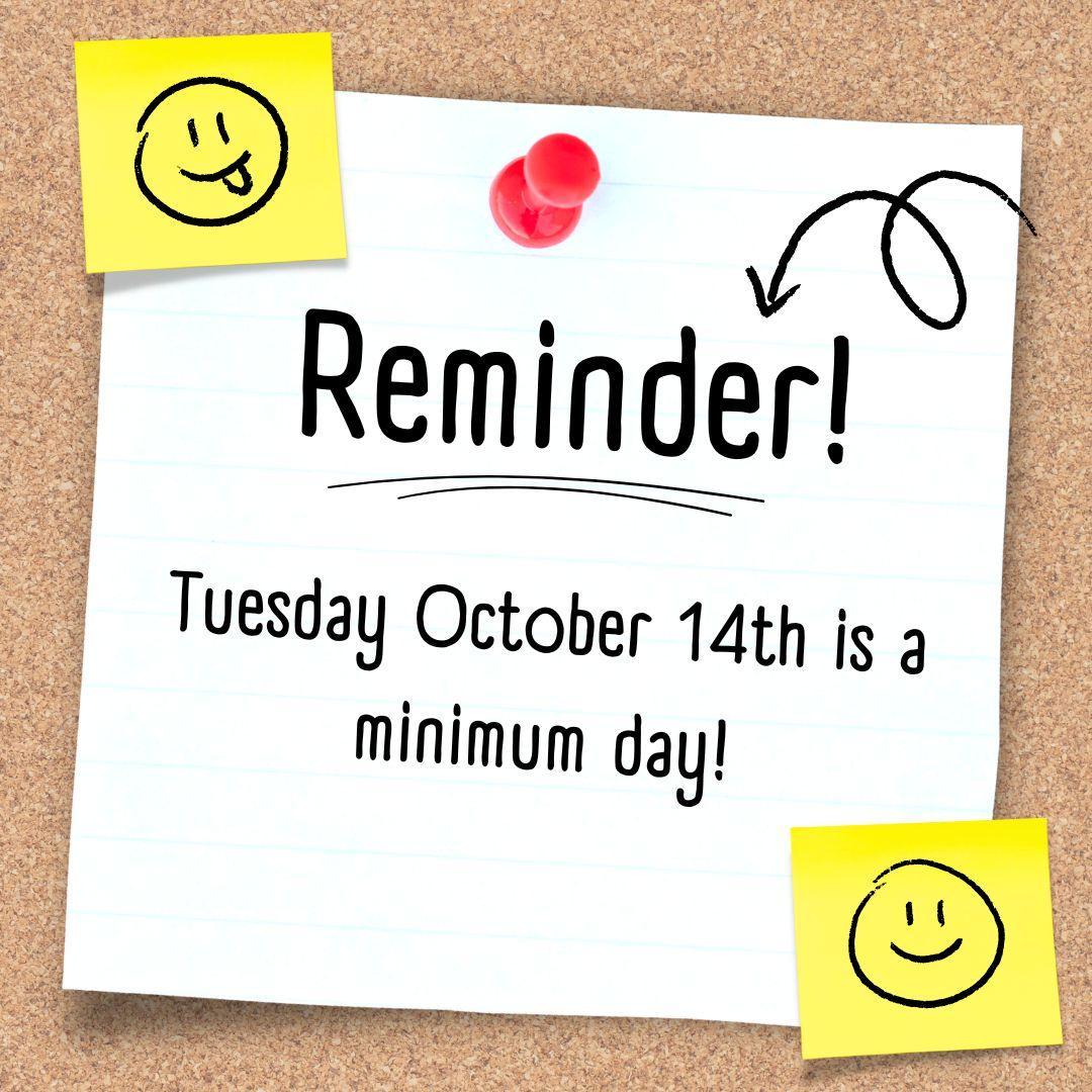 Tuesday, October 14th is a minimum day for our site staff development day. Dismissal will be at 1 PM.